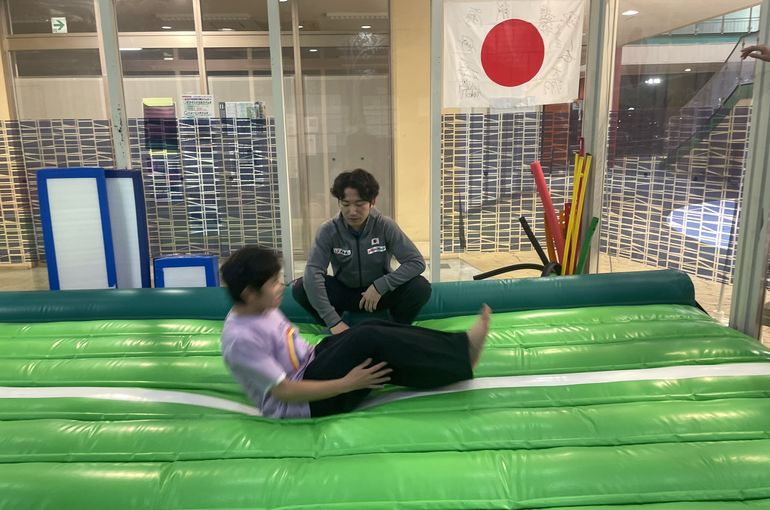 エアートランポリンでは後転や側転など基礎的な技から始まり…