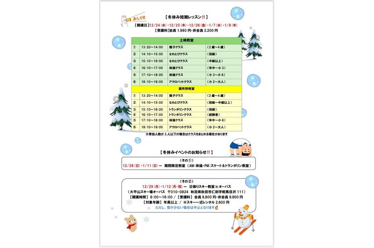 冬はスキー・スケート夏は水泳教室と運動を体験しましょう
